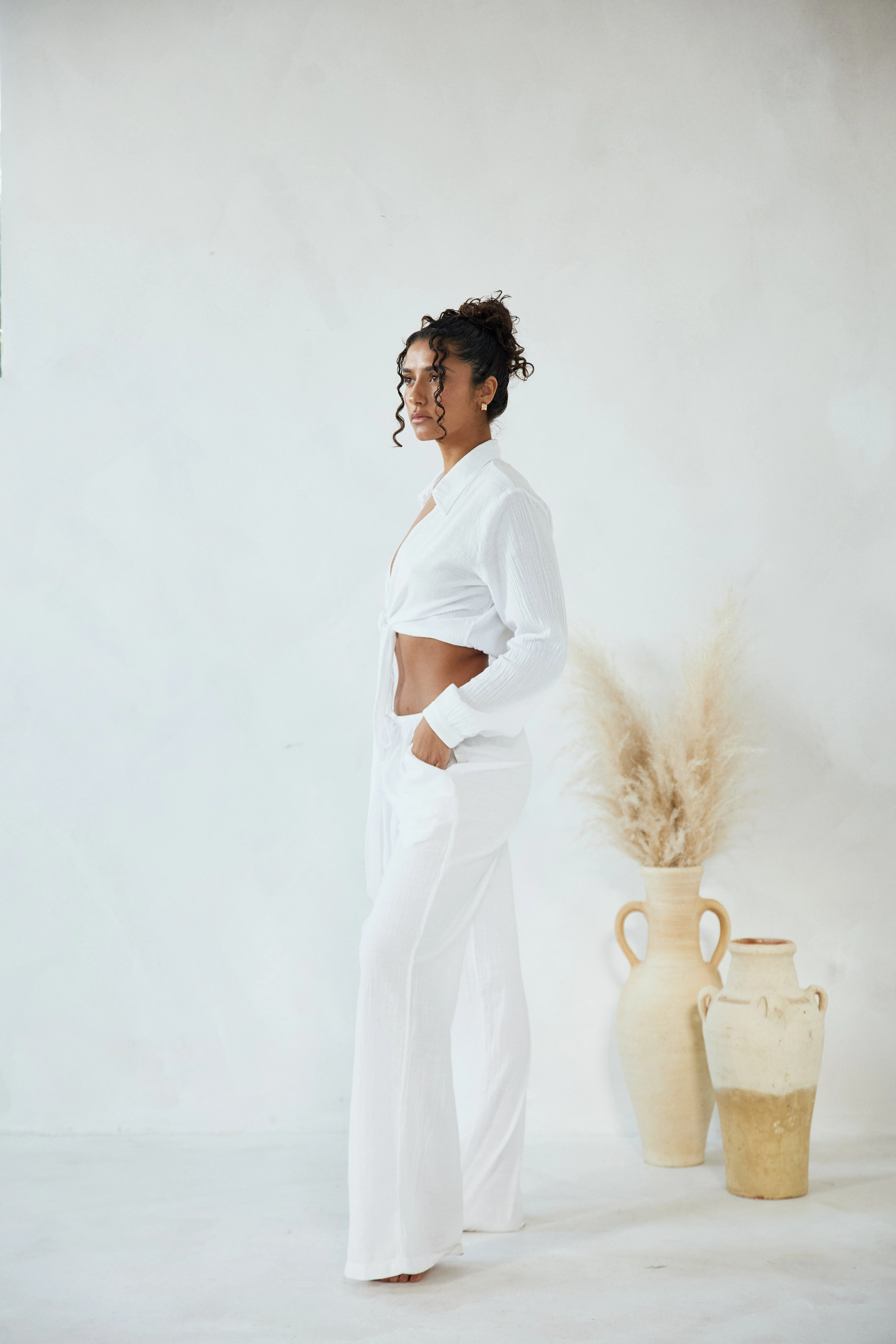 Our classic piece! The versatile Chiara Pant is the perfect beach pant, made with our lightweight cotton fabric. This pant features pockets and an adjustable elastic drawstring waist that allows you to wear it either low or high on your waist.Â